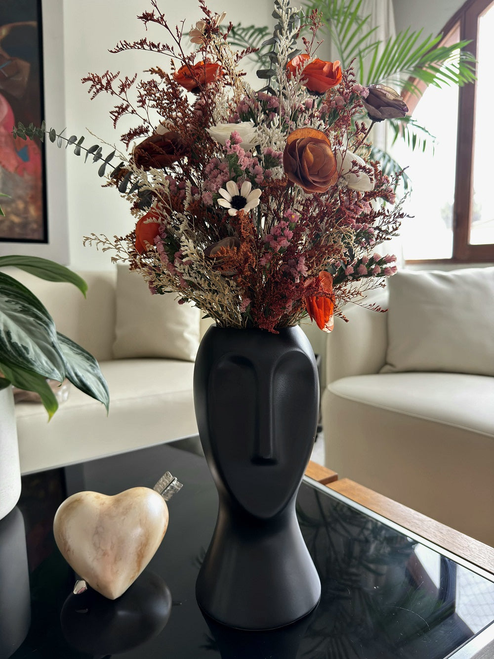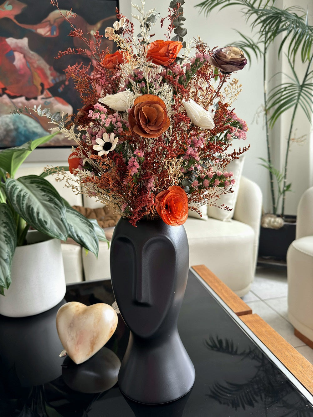Arreglo Faz, elaborado de flores, follajes y semillas naturales secos y preservados en tonos beige, terracota y nacarado. Presentadas en esta preciosa Pieza Faz (rostro o cara) de finos acabados color grafito de la linea deco de Tahua pottery.
