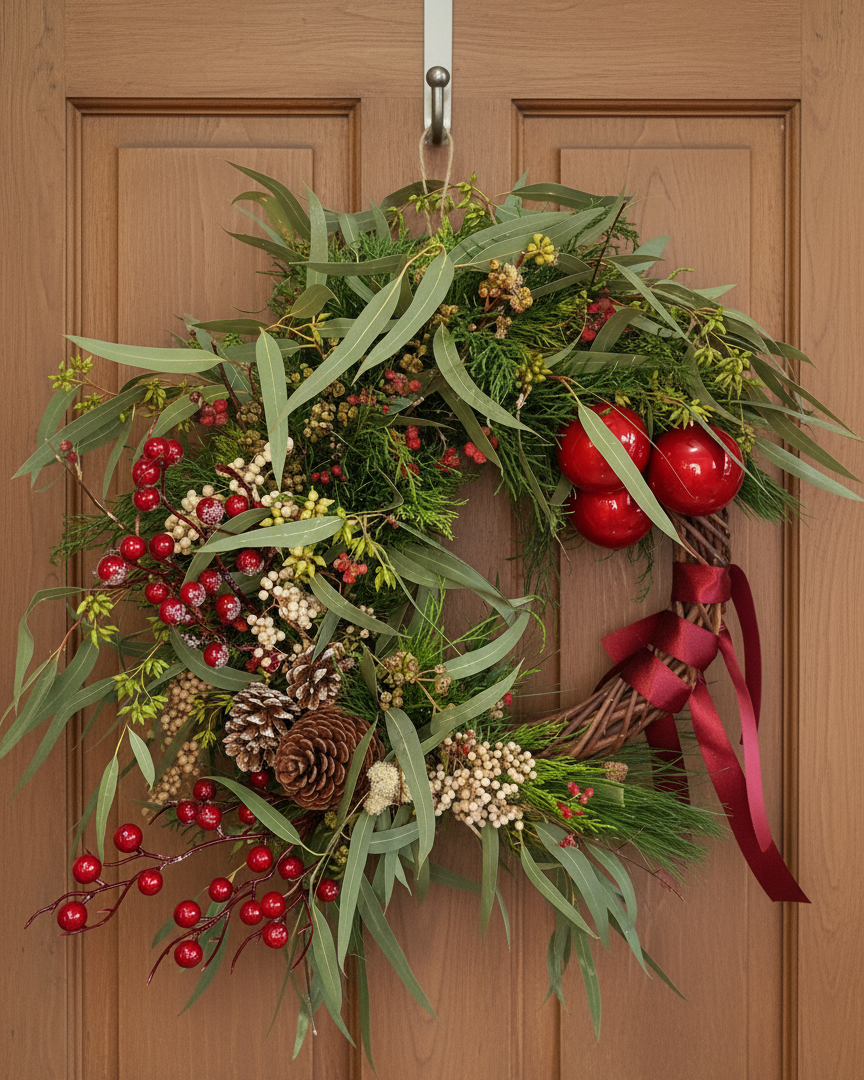 - Contiene Ciprés natural, Thuja, Pino, Eucalipto, Piñas, Molle y otros complementos decorativos navideños.