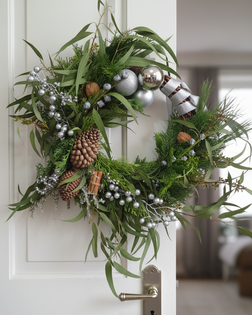 - Contiene Ciprés natural, Thuja, Pino, Eucalipto, Piñas, Molle y otros complementos decorativos navideños en tonos plata